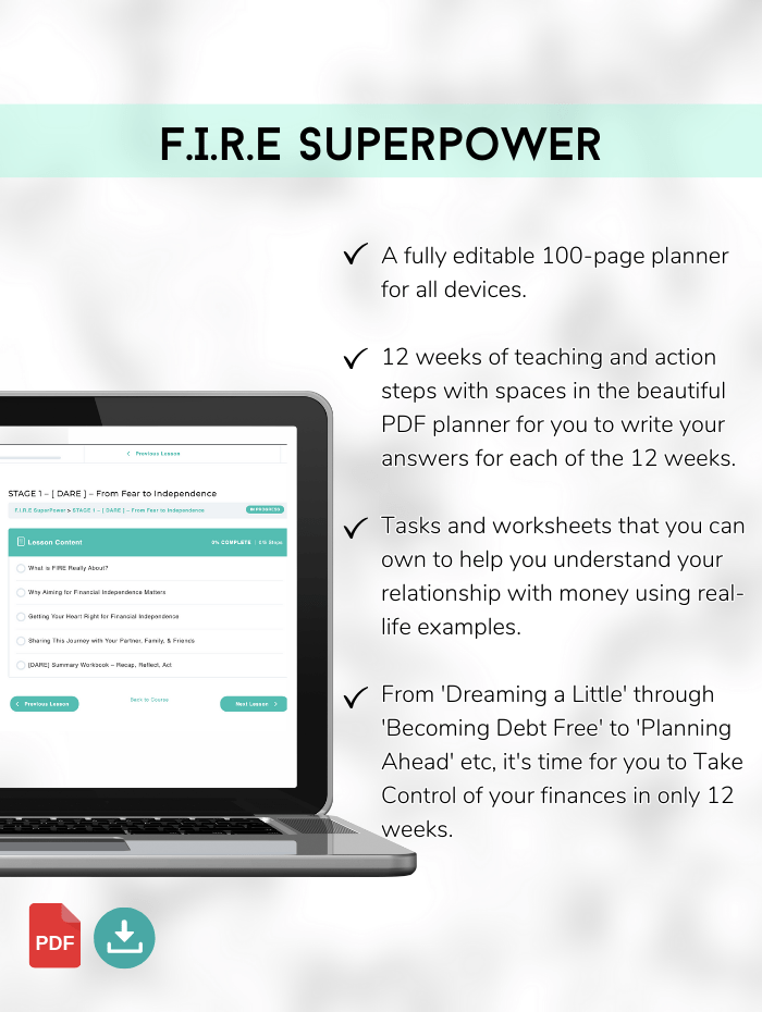 FIRE SuperPower™ is a thorough step-by-step roadmap that will show you how to use the money you make today and other money-making opportunities to design a life that means that you never have to work forever and instead, money will work for you.